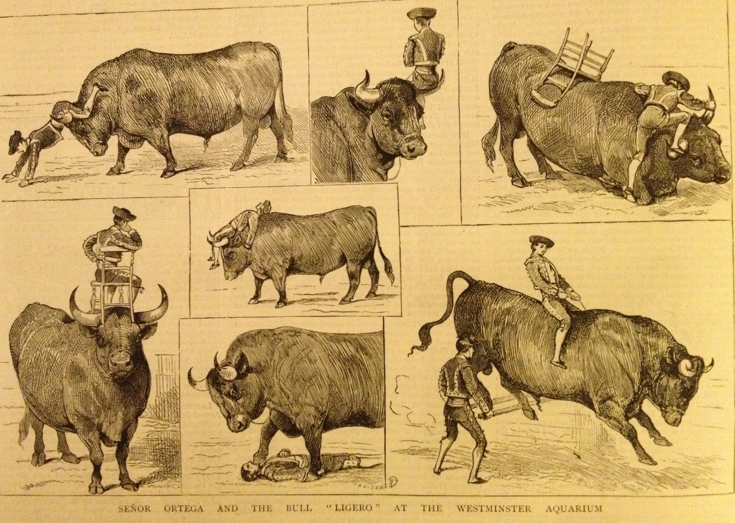 The performance of Señor Ortega and his trained bull at the Aquarium calls up reminiscences of the marvellous power of Mr Rarey, the horse-tamer, and is certainly not less surprising and entertaining. The docility of the huge pet, its evident fondness for its master, and anxiety to comply with his wishes, are clear proofs that kindness alone has been resorted to in the course of its education. Some of the feats are shown in our illustration; but many others are performed, including a sham bull-fight, in which “Ligero” rushes in mock rage at the crimson banner carried by Señor Ortega, and feigns to toss and gore him. The Señor is in the habit of riding “Ligero” through the streets of the various cities in which they are engaged to exhibit, and it is said that he never retires to rest without kissing and being kissed by the affectionate animal.”