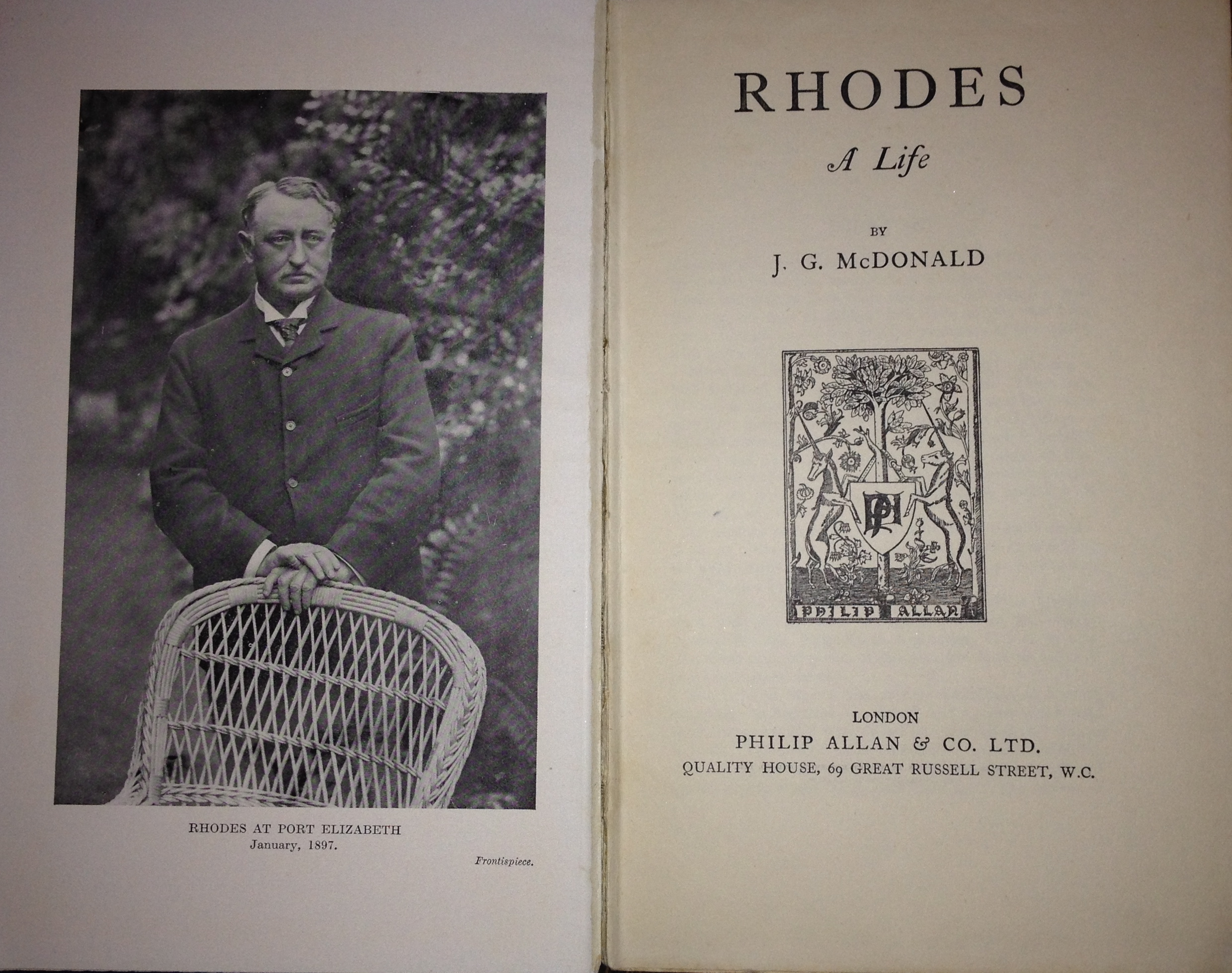 Frontispiece of Rhodes A Life by J G McDonald first published in 1927 by Philip Allan & Co. Ltd. London