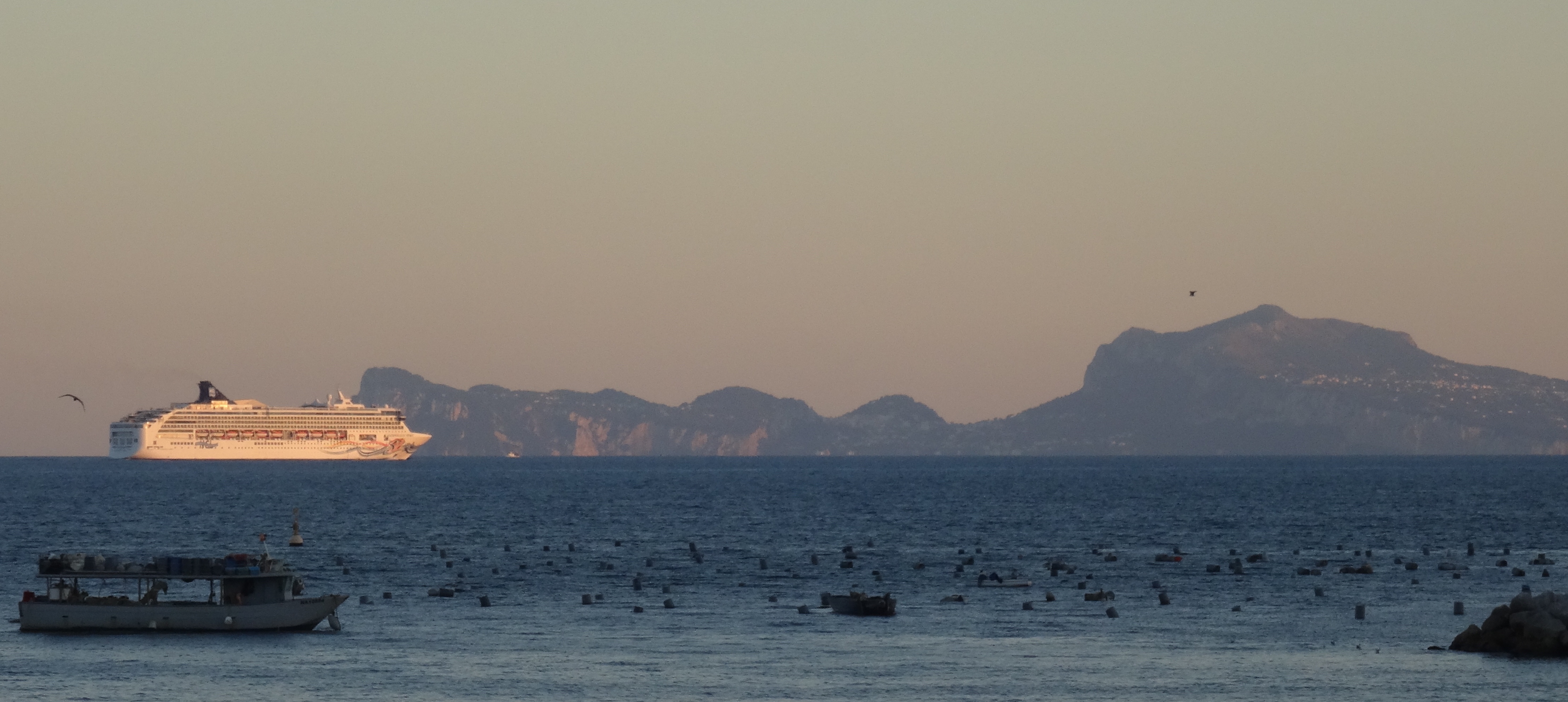 A cruise ship heads out of the Bay of Naples past the island of Capri.