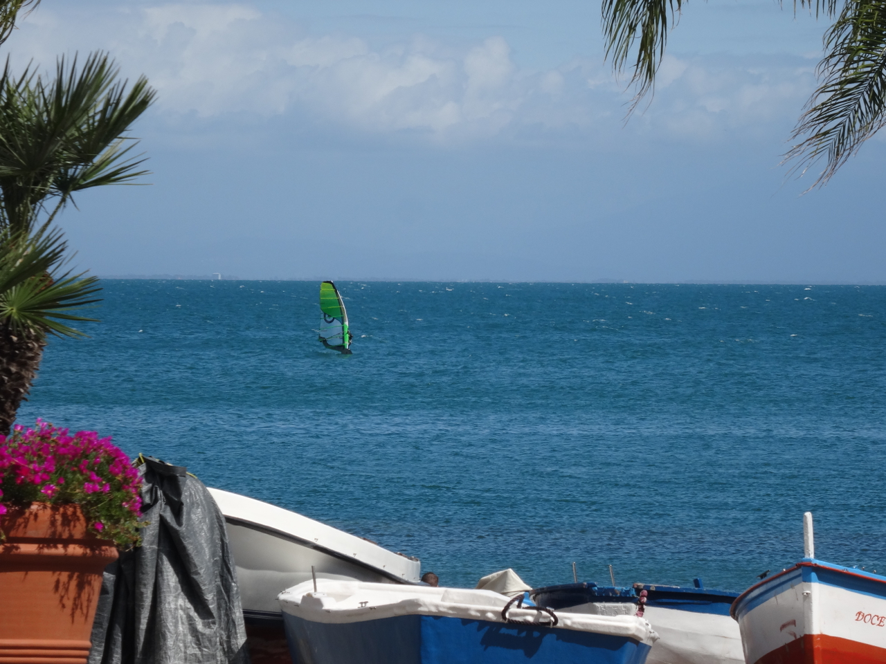 Families, mainly Italian and aged from bambini to nonni, sprawl and splash on the shore beyond our table.  Sails skip over wind ripples.
