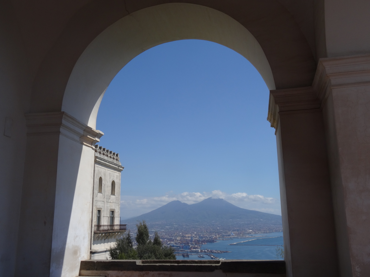 The view from Castel Sant’Elmo over the roofs of the Certosa di San Martino across Naples and on towards Vesuvius.