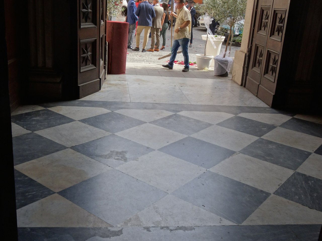 The cathedral doors are open for a few minutes while scattered rose petals are cleared from the entrance.