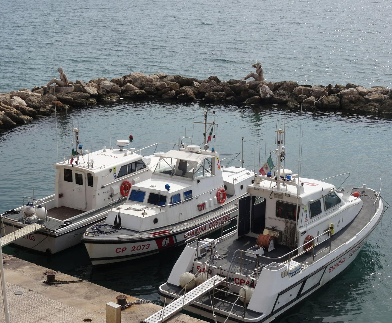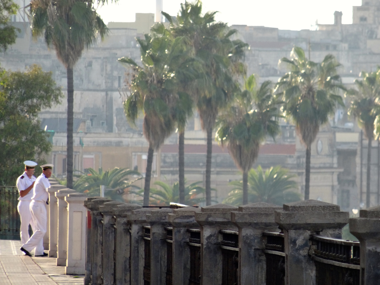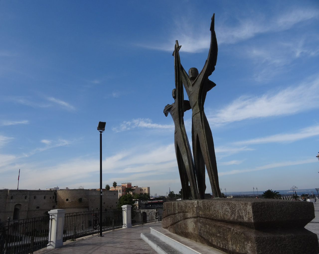 The inscription on their base remembers the Italian naval personnel who died in the Second World War between 1940 and 1943, a date range that includes November 1940 when the Italian navy was destroyed in the bay by English bombers in the ‘Battle of Taranto’.