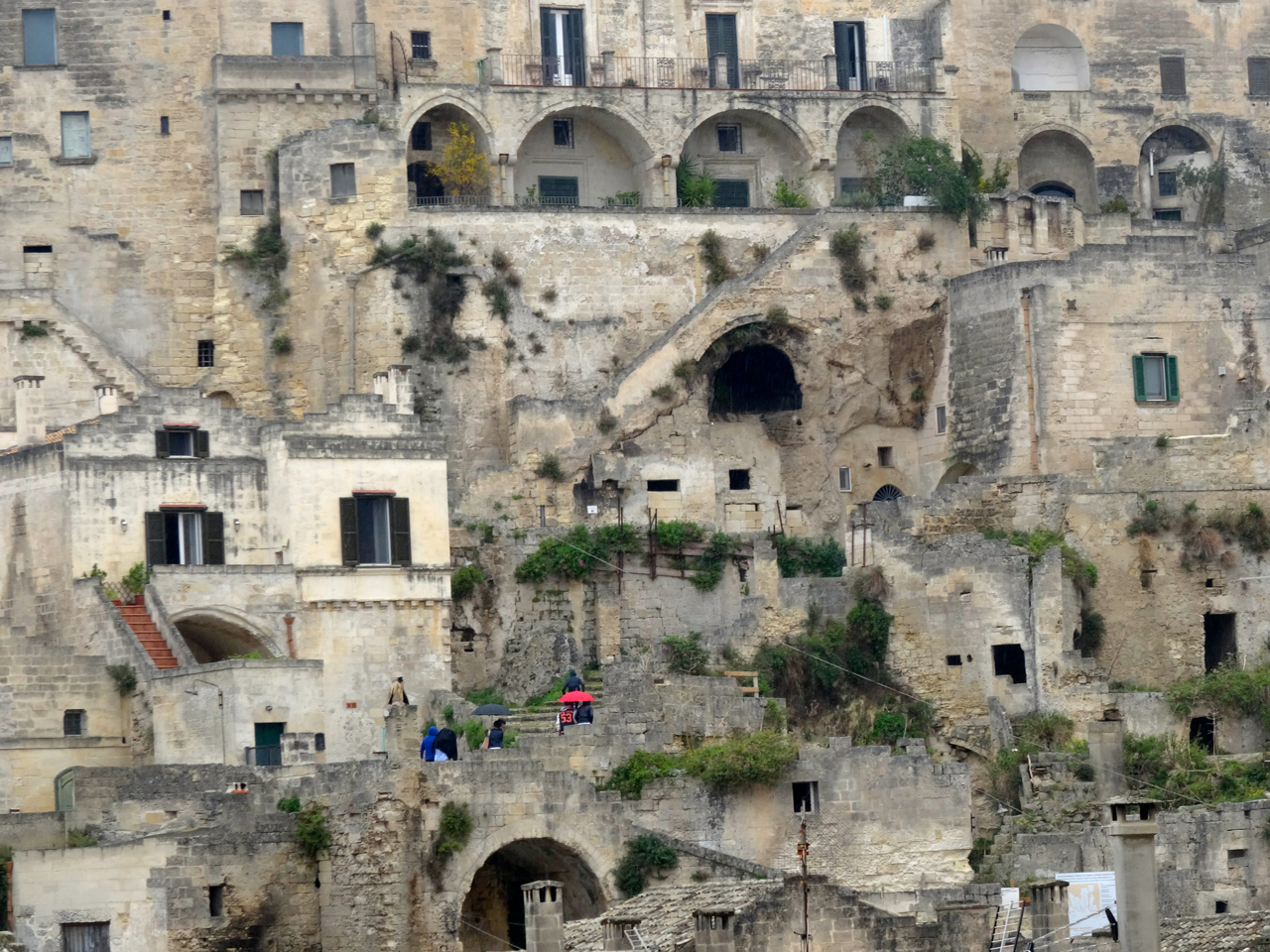 Tourist umbrellas trickle past.  We watch their plastic colours zig-zag through the sassi – new life drawn back to the age old rocks of Matera.