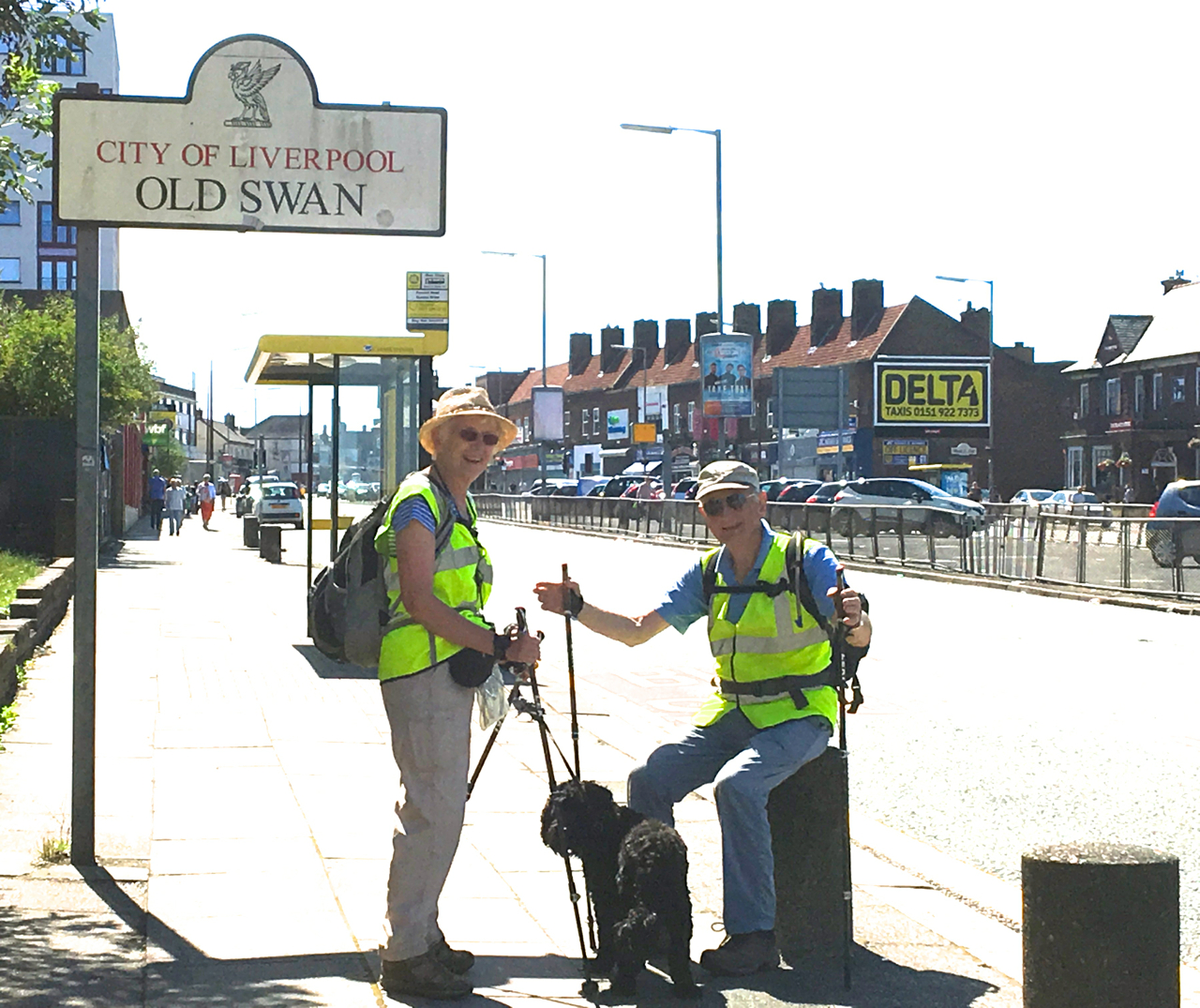 The end of the 2017 Hull to Liverpool fundraising walk for ZANE – Tom and Jane Benyon with Moses in front of the Metropolitan Cathedral of Christ the King in Liverpool