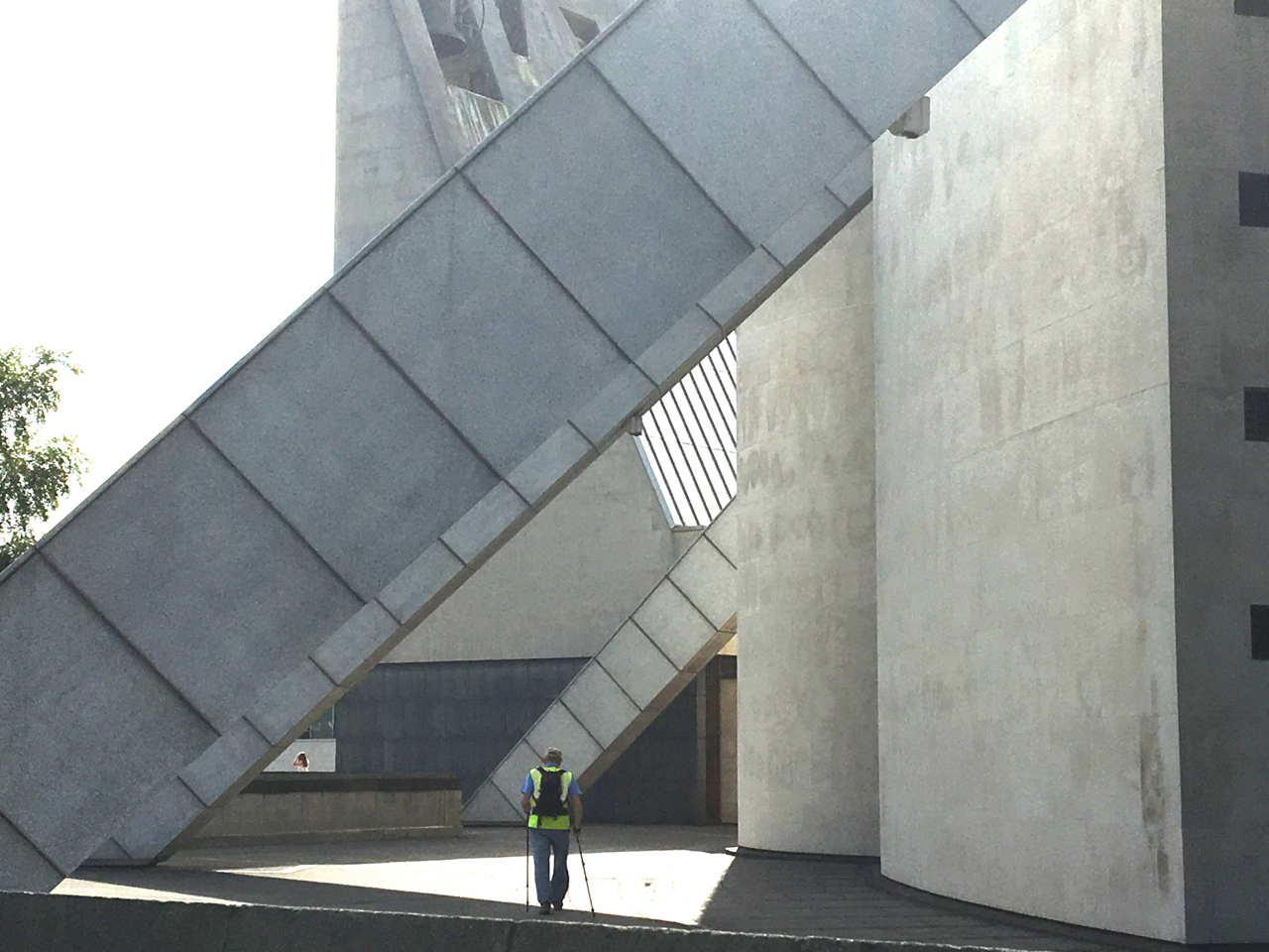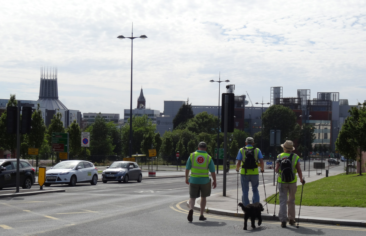 It does not take long for us to learn the same technique. There is one brief pause for photographs straight into the blazing sun, and then, like four dots on a dice, we roll on towards the closest cathedral in Liverpool – Christ the King.