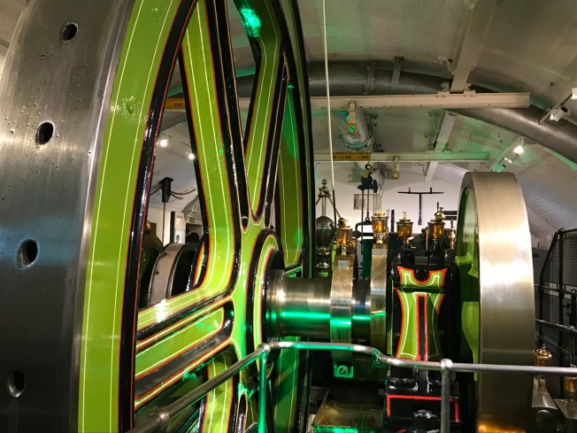 We soaked up as much as we could, and then went down the wide stairs to the pavement outside, and round to the engine room where the polish and green of its steam driven days filled the low spaces. It was the last section of our wander through the exhibition, and well worth the walk.