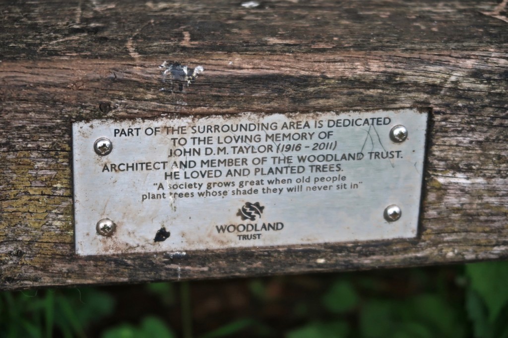 Near the view was a simple bench, with two solid planks for a seat, and this inscription, in memory of one of the ‘architects’ of the Woodland Trust, who ‘loved and planted’ trees. My thanks to him and to all those who grow these places for us. It is hard to describe how much we’ve loved the shade of tall trees during this walk.