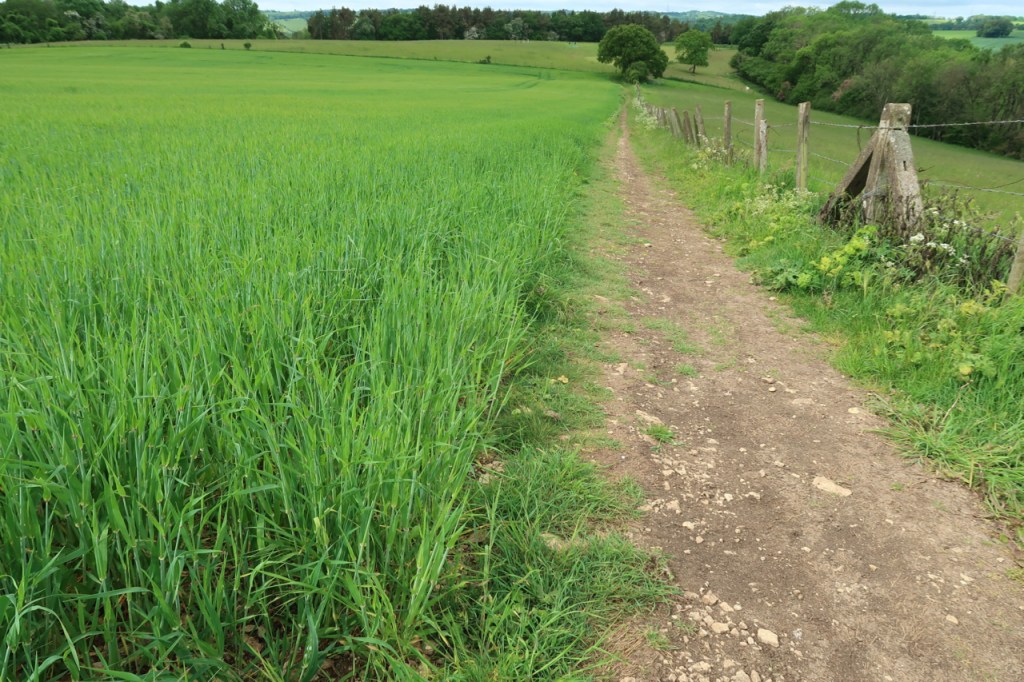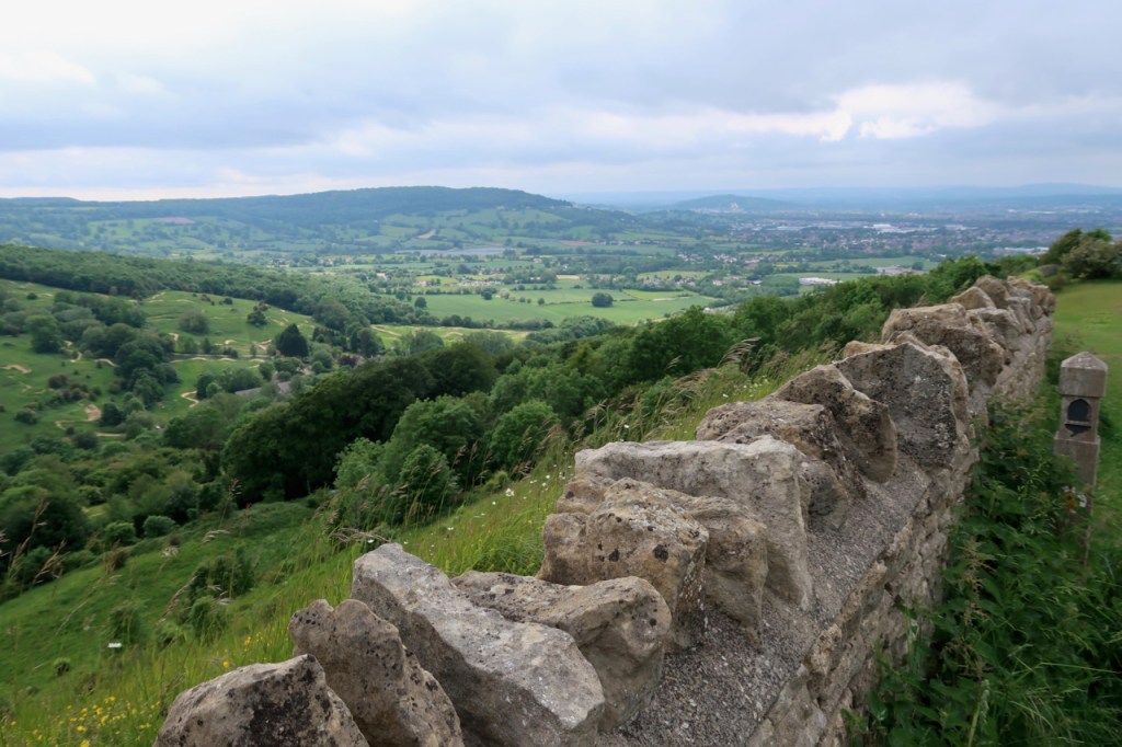Today, after the trees, came a short section along wheatfields, rippled with breeze, then back through woodland and on towards the miles of ridge that run above Cheltenham to Leckhampton Hill. The views spread in all directions, framed on one side by what looks like at least a mile of recently restored dry stone wall.