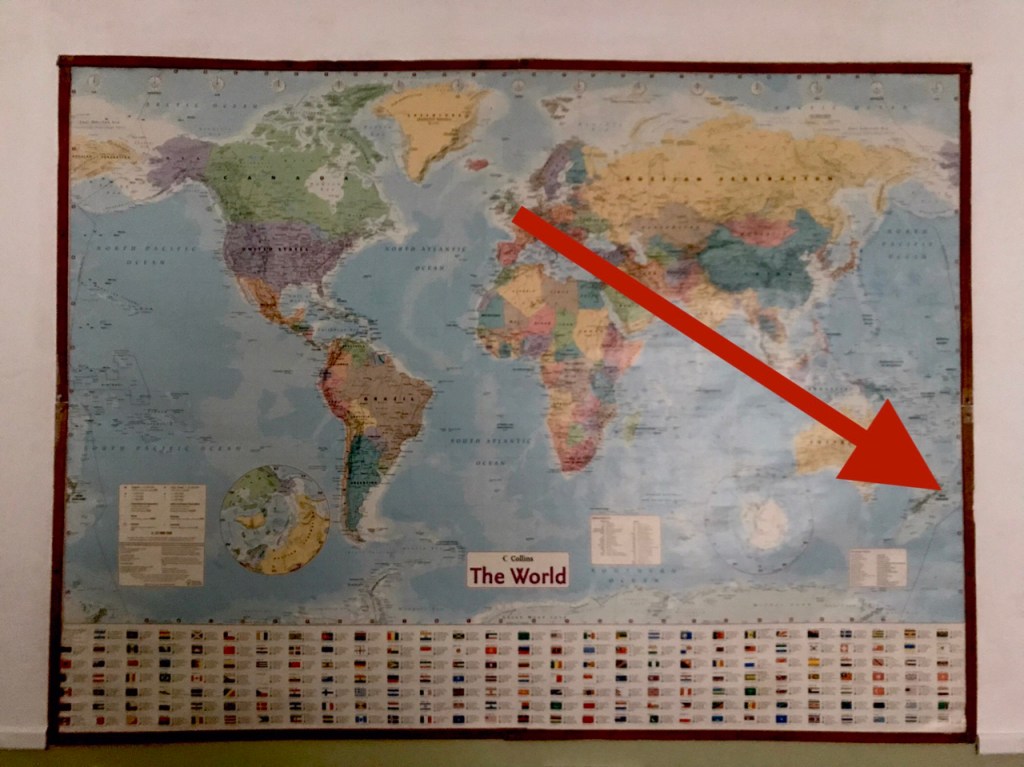 Thirty hours of travel were about to end. London was now the dot out of sight, and there below was the upside down, lumpy exclamation mark that I’d peered at so often on our map on the kitchen wall.