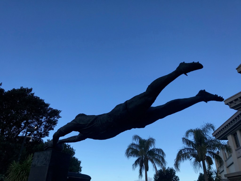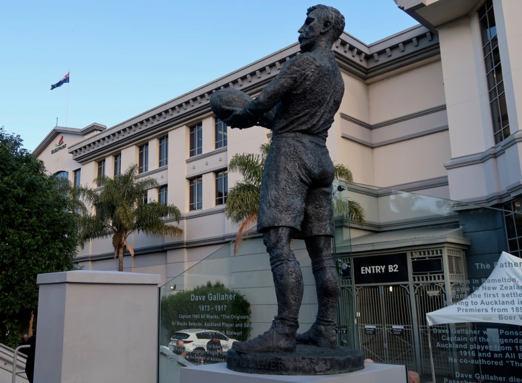 On the far side of the stadium, two other sculptures, different from the tekoteko, recorded significant players in the All Blacks’ history.
