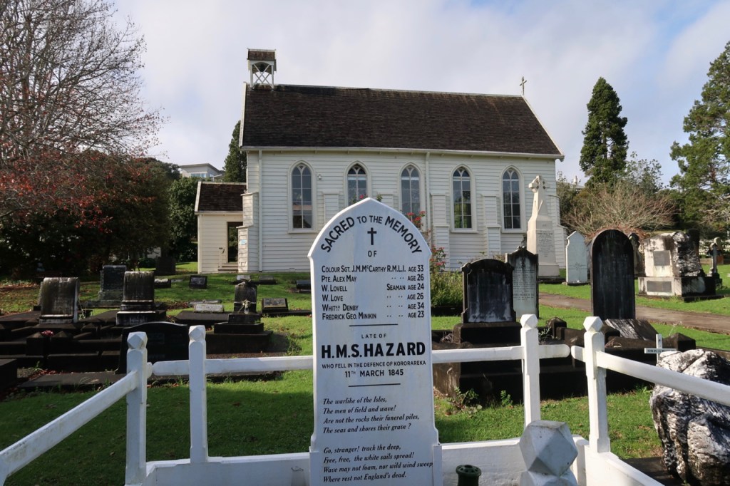 Its gravestones tell the stories of the town – of lives lost in battle, and of families devastated by disease. A stone just outside its white picket fence remembers the fighting that took place there between the British Army and the Māori in 1845, during the Flagstaff Wars.