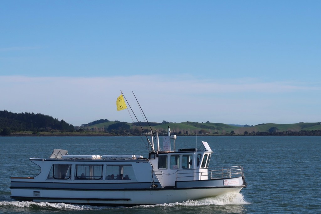 I dragged my suitcase along the jetty to book my ticket. The first ferry was the Happy one, with a barefoot skipper, and two (sometimes one) smiley face flags flying from flishing poles on either side of the wheelhouse. It didn’t take long to load the handful of passengers, and then we were out on the shining water of the Bay of Islands.