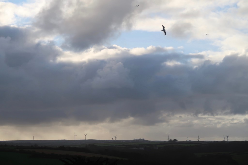 The photograph above was taken just after the sun had risen. It was a bruised dawn but it turned into a beautiful day. In front of us lay the sea, green-blue and whipped with white horses, while behind us turbines and seagulls span across the sky. This was their kind of day. They danced with the elements, while we clung like limpets to the ground.