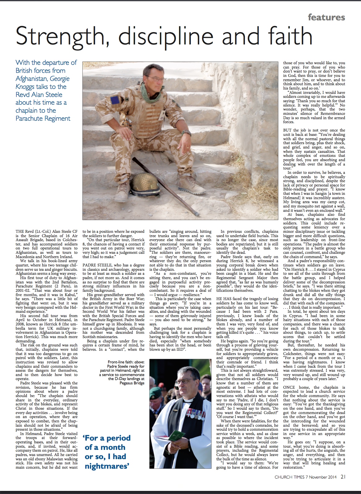 The Reverend Alan Steele MBE is in his early fifties and is the senior padre of 16 Air Assault Brigade based in Colchester. The interview is in his book-lined Army quarter where his two teenage children serve us tea and ginger biscuits.