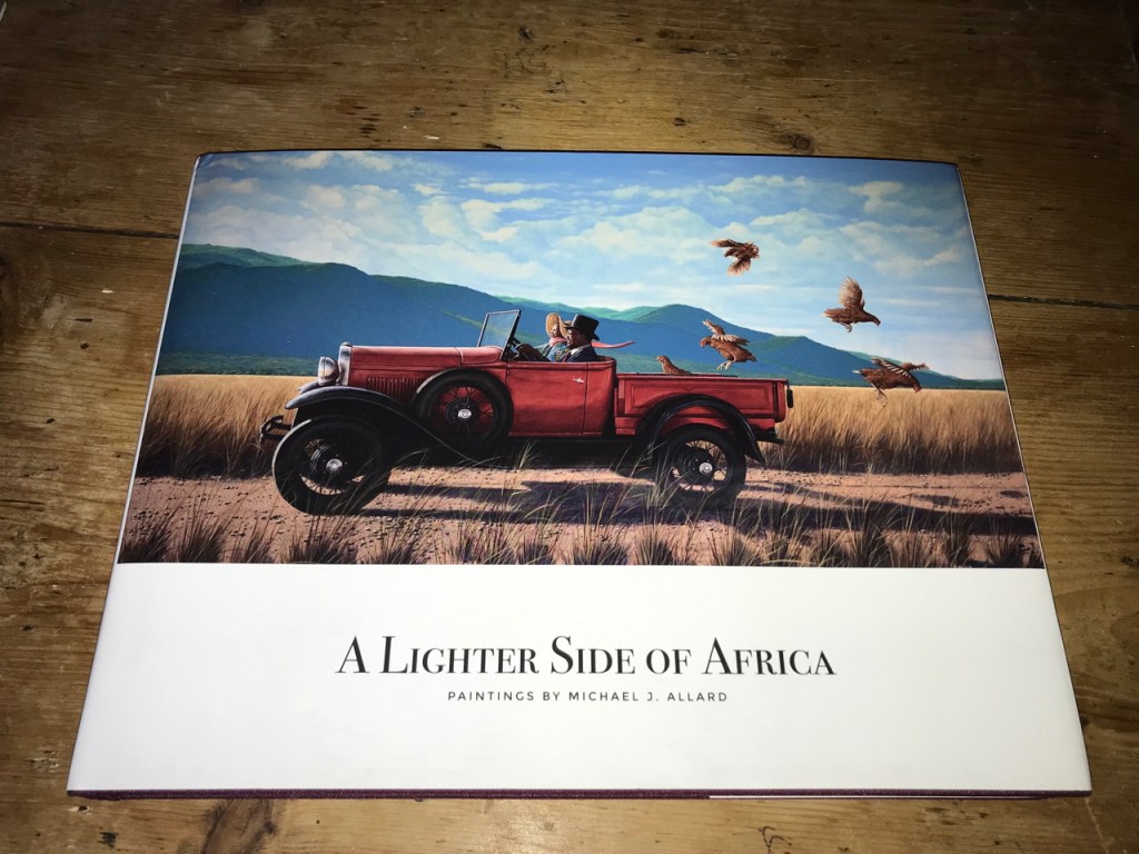 There is also a painting of two boys being towed on a blanket behind a warthog, with a flock of African sacred Ibis flying above them. The title of that painting is ‘Drag Racing – Africa Style’. On the opposite page there is description of how the painting came to be which begins with the quotation by the artist: “I do enjoy attempting to make something completely ludicrous appear perfectly feasible.”